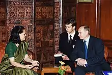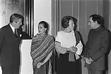 The couple had two children, Rahul Gandhi (born 1970) and Priyanka Vadra (born 1972). Despite belonging to the influential Nehru family, Sonia and Rajiv avoided all involvement in politics. Rajiv worked as an airline pilot while Sonia took care of her family. She spent considerable amount of time with her mother-in-law, Indira Gandhi; she recalled her experience in a 1985 interview with the Hindi-language magazine Dharmyug, "She [Indira] showered me with all her affection and love".[29] Soon after the latter's ousting from office in 1977 in the aftermath of the Indian Emergency, the Rajiv family contemplated moving abroad for a short time.[30] When Rajiv entered politics in 1982 after the death of his younger brother Sanjay Gandhi in a plane crash on 23 June 1980, Sonia continued to focus on her family and avoided all contact with the public.[31]