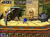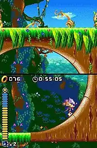 Sonic Rush is a 2D platform game, similar to earlier games in the series as well as later ones like Sonic Advance and Sonic Mania. The player controls either Sonic the Hedgehog or Blaze the Cat, who differ in terms of special abilities.[3] In the tradition of past Sonic games, gameplay consists of moving quickly through levels, collecting rings and defeating enemies.[4][5][6] The player collects rings as a form of health; when they are attacked by an enemy, their rings bounce in all directions. If they are hit by an enemy and have no rings, they lose a life. A life is also lost if the character is crushed, drowns, falls into a bottomless pit, or exceeds an act 10-minute limit. Both of the DS's screens are used to display the play area, with the player's character moving between them as necessary.[4][7] Levels in the game are divided into "zones", each consisting of two acts of normal gameplay then a 3D boss battle. The course of the game differs depending on whether Sonic or Blaze is chosen;[8] the seven zones are the same, but are accessed in different orders.[3] During boss battles, Blaze fights Doctor Eggman[9] and Sonic fights an Eggman doppelgänger called Eggman Nega.[7][10] As the characters' stories progress, they meet each other several times and unite in the final zone that comes after the seventh.[8] The game features special stages the player can access via certain handles in order to obtain the Chaos Emeralds. These Special Stages resemble those of Sonic the Hedgehog 2 and use the DS' stylus controls.[11]