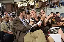 Eggerickx has been vocal in condemning anti-gay laws and discrimination throughout the world.[13][14][15][16] She has also spoken out publicly against Sharia law[17] and supported the One law for all campaign against Sharia law in the United Kingdom, launched at the House of Lords, London, in 2008.[18][19] Eggerickx was also involved in launching The Freedom of Thought Report, published annually since 2012 on International Human Rights Day, which examines the treatment of non-religious people, atheists and freethinkers across the member states of the United Nations.[20][21]