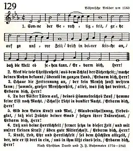 A 1970 ecumenical gathering at the centre of church music education in Schlüchtern suggested a different last stanza, also found in David's hymn.[8][5] The hymn became part of many hymnals, beginning with the Protestant Evangelisches Kirchengesangbuch (EKG) in 1950.[9] It appeared in 1971 in the Hymn Book of the Anglican Church of Canada, in the Dutch Liedboek voor de kerken of 1973.[6] The ecumenical version was included in the Swiss Gemeinsame Kirchenlieder in 1973,[9] in the Catholic Gotteslob of 1975, and in the Czech Evangelicky Zpevnik in 1979.[6] It appears in the current Protestant hymnal Evangelisches Gesangbuch as both EG 262 (ecumenical version) and EG 263 (Riethmüller's version),[2][10] and in the Catholic Gotteslob as GL 481 in the ecumenical version. It is featured in many songbooks.[1]