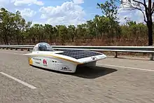 With a carbon fiber outer hull, the car weights less than 200 kg.[5] 4 m2 (43 sq ft) of high-efficiency silicon solar cells are powering the car and charging the buffer battery, employing maximum power point trackers (MPPTs) to maximize energy yield. A single custom-built electric motor propels the car to cruising speeds of approx. 70 km/h (43 mph), with a top speed of more than 130 km/h (81 mph).[6]