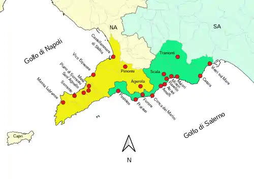 Map of the Sorrentine Peninsula, showing municipalities in the provinces of Naples and Salerno.