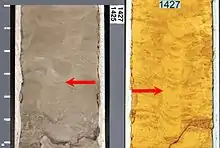 Nearly 40 m thick, the upper section of the formation is composed mostly by a series of cross-bedded, cross-laminated, wave-rippled and bioturbated sand and heteroliths with sporadic syneresis cracks, pyrite nodules, the ichnofossils Planolites isp. and Teichichnus isp. and brackish to marine palynomorphs, mostly dinoflagellates.[1] This upper part has a stratum more characteristic of nearshore environments with abundant lagoons, coastal lakes and fluvial channels, with the clean sand at the top probably representing a marine shoreface.[1] The Korsodde section, 93 m thick, is composed mostly of coarse-grained sands with cross-bedding and parallel lamination, being mostly black due to an abundant organic debris.[1] This section has been interpreted as part of the large local fluvial system, probably as a series of minor fluvial channels that were connected with coastal lakes and lagoons where riparian vegetation was abundant, judging by the presence of megaflora remains and palynomorphs.[1] Small ichnofossil burrows and larger burrows, including Diplocraterion isp., are common, indicating that there was at least one subunit that was the fill of an estuarine channel.[1] The uppermost part of the formation in the Korsodde section consists of fine-grained sands of yellowish to brown color with cross-stratification and parallel lamination, along with sandstones with thin bioturbated and wave-rippled heterolithic beds.[1]