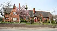The school building dates from 1876 and is listed at grade II. A single-storey building of three bays with a bell turret forms the school, with an adjoining two-storey schoolmaster's house; both are in red and blue brick with a blue tile roof.[36]