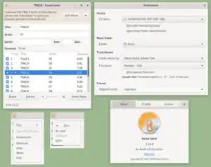 Sound Juicer is the official CD ripper program of GNOME. It is based on GTK, GStreamer, and libburnia for reading and writing optical discs.[2] It can extract audio tracks from optical audio discs[3] and convert them into audio files that a personal computer or digital audio player can play. It supports ripping to any audio codec supported by a GStreamer plugin, such as Opus, MP3, Ogg Vorbis, FLAC and uncompressed PCM formats. Versions after 2.12 implement CD playing capability. Last versions produce lossy formats with default GStreamer settings.