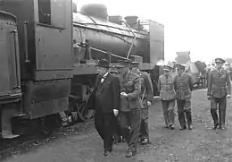 Armoured boiler cladding was added. The cab, front and sides of the smokebox were enclosed and some fittings on top of the boiler and firebox such as the safety valves and top feed were boxed in armour. Armour plating was also fitted to the sides of the running boards. The picture shows the locomotive and armoured train being inspected during 1942 by the Honourable F.C. Sturrock MP, South Africa’s Minister of Transport at the time.[9]