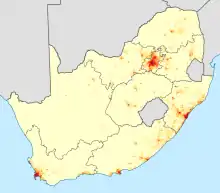 About 20% of all coloured people in South Africa speak English as a home language.[3] They are primarily concentrated in the provinces of Kwa-Zulu Natal and northeastern parts of the Eastern Cape in the former Transkei with some transplants being found in Johannesburg.