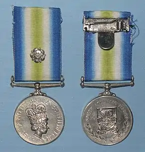 The medal is made of cupronickel, and is 36 mm in diameter.[2] It was struck by the Royal Mint and issued by the Army Medal Office, Droitwich. It has the following design:[3]