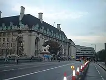 The South Bank Lion is an 1837 sculpture in Central London. Since 1966 it has stood next to County Hall, on the South Bank of the River Thames. It is a significant depiction of a lion, along with the four that surround Nelson's Column in Trafalgar Square just across the river.