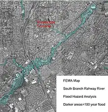 The South Branch is subject to both tidal and fluvial flooding. With coastal surges, the Rahway River can cause backflow into the South Branch as far as St. Georges Bridge in Woodbridge. Outflow from the south Branch to the main channel is inhibited by the "U" shape turn in the Rahway River and six bridge constrictions within a mile.[2] The South Branch has an 11.6 square mile drainage area from "intensely developed portions" of Rahway, Edison, Woodbridge and Metuchen. Repeated "flashy" fluvial flooding in this river is a consequence of urbanization with impervious surfaces exacerbated by downstream channel constrictions, stream bank decay and steep hills. Fluvial flooding is felt to be the major component of flooding.[3]