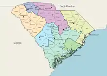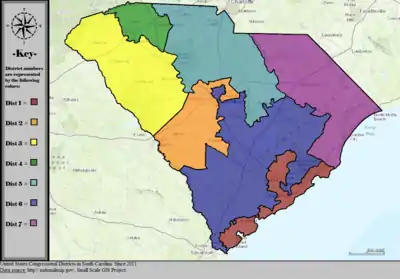 List of members of the South Carolinian United States House delegation, their terms, their district boundaries, and the districts' political ratings according to the CPVI. The House delegation has 7 members, including 6 Republicans and 1 Democrat as of 2021.[2]