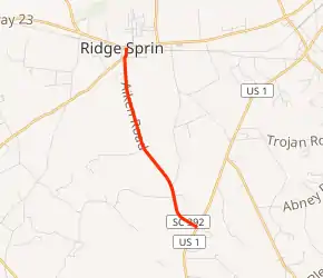 SC 392 begins at an intersection with U.S. Route 1 (US 1; Columbia Highway) south-southeast of Ridge Spring, Aiken County. This intersection is southwest of Aiken Wayside Park. It travels to the northwest and curves to the north-northwest. The highway enters Saluda County. It crosses Flat Rock Creek and passes by Flat Rock Cemetery just before entering the city limits of Ridge Spring. At Main Street, it meets its northern terminus, an intersection with SC 23/SC 39.[3]