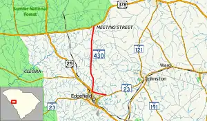 South Carolina Highway 430 (SC 430) is an 11.740-mile-long (18.894 km) state highway in the west central part of the U.S. state of South Carolina. The highway travels in a south-north orientation from just northeast of Edgefield northwest and then due north to a point on the edge of Sumter National Forest, all within Edgefield County.