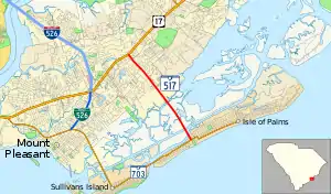 SC 517 begins at an intersection with SC 703 (Palm Boulevard) in Isle of Palms. It passes over the Intracoastal Waterway. The only significant intersection on the route, aside from each terminus, is with Rifle Range Road. The road continues northwest until it meets its northern terminus at U.S. Route 17 (US 17) in Mount Pleasant.[2]