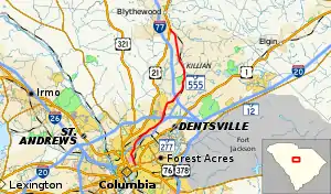 SC 555 traverses 14.67 miles (23.61 km) from SC 12 in downtown Columbia to U.S. Route 21 (US 21) near Blythewood. Before Interstate 77 (I-77) was completed in the area, SC 555 served as a major thoroughfare; today it is an alternate route. The highway is four lanes south of I-77 and two lanes north of it.[2]