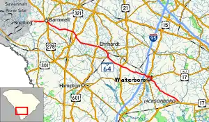 South Carolina Highway 64 (SC 64) is a 73.730-mile (118.657 km) primary state highway in the U.S. state of South Carolina. It serves the cities of Barnwell and Walterboro while also providing a direct route to Charleston, via U.S. Route 17 (US 17).[4]