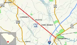 The route of SC 68 travels generally in a northwest to southeast direction, beginning at a junction with U.S. Highway 278 (US 278 just south of Varnville. The highway travels in a nearly straight line for its entire length, paralleling the Port Royal and Augusta Railway (today the CSX Augusta Subdivision). The roadway passes through the small hamlet of Early Branch before widening to a four-lane configuration about one mile (1.6 km) north of the I-95 junction. Passing underneath I-95, SC 68 returns to a two-lane configuration as it enters Yemassee before terminating at an intersection with US 17 Alternate and US 21.[2]