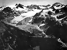 South Cascade Glacier is a large alpine glacier in the North Cascades of Washington, USA.[2] It is bordered on the east by 8,261-foot (2,518 m) Sentinel Peak, and is about 17 mi (27 km) north of Glacier Peak in the Glacier Peak Wilderness. Meltwater from the glacier flows directly into South Cascade Lake, which feeds the South Fork Cascade River, which is a tributary of the Skagit River.