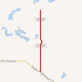 SD 239 begins at an intersection with SD 10 / SD 45 south of Long Lake. Here, the roadway continues to the south as 350th Avenue. It travels to the north. Approximately 3–4 miles (4.8–6.4 km) later, SD 239 curves slightly east to bypass a small lake. It then curves back to the west and straightens out to a due north course for the last 3 miles (4.8 km) before it terminates at 106th Stree on the south side of Long Lake. SD 239 then becomes 350th Avenue after this terminus, which continues to the North Dakota state line.[2]