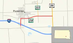 SD 258 begins at a diamond interchange with exit 308 of I-90 and travels north. The route enters the city of Plankinton almost immediately and continues north. The highway turns east onto Davenport Street in Plankinton and a curve takes the highway to the northeast. After leaving Plankinton, the road curves back to the east and continues through open plains for about one mile (1.6 km) before reaching its eastern terminus at an intersection with US 281. The roadway continues east of this intersection as County Road 34.[2][3]