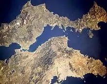The South Euboean Gulf (Greek: Νότιος Ευβοϊκός Κόλπος, Notios Evvoïkos Kolpos) is a gulf in Central Greece, between the island of Euboea and the Greek mainland (Boeotia and Attica). With a total length of approximately 50 km and a width of 10 to 20 km, it stretches nearly diagonally from northwest to southeast, from the Euripus Strait, which connects it to the North Euboean Gulf, to the Petalies Gulf near Agia Marina in the south.