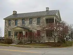 The former South Hero Inn building occupies a prominent location at the central intersection of South Hero, set at the southwest corner of its major crossroads, the junction of South Street and US 2. It is a 2+1⁄2-story stone structure, with a gabled roof and a two-story wood-frame ell projecting to the west. It presents formal facades to both roads, with its main roof gable set parallel to South Street. The more elaborate facade faces US 2, with a two-story porch across the three-bay facade, supported by square posts, with a decorative valance and low balustrades. The gable above the porch has modillion blocks in the eaves, and a Federal style fan at the center of the pediment. The facade facing South Street is five bays, with a center entrance flanked by sidelight windows and sheltered by a gabled porch with a similar valance and turned posts. Most windows are sash, set in rectangular openings. The walls consist of quarried square-cut hammered stone blocks.[2]