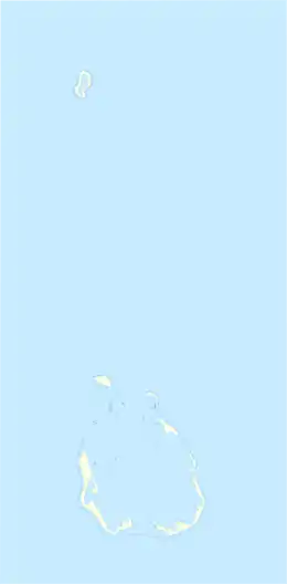 South Island forms the southwestern edge of the atoll, so it is very curved. While the sea side is rather straight, consists of a beach and drops steeply after a few meters, the lagoon side is branched and only drops very gently. The island is heavily forested. Directly to the north are nine smaller islands, the first of which is Middle Mission Isle, followed by the inhabited Home Island after 4.3 km (3 mi). Numerous tiny, mostly elongated islands can be found on the lagoon side, never more than 350 m from the coast. In the west there are three small islands off the coast (North Goat Island, East Cay and Burial Island), followed by a 1.2 km (1 mi) wide channel. Behind it is another small island and, a total of 2.3 km (1 mi)[2] from South Island, the main island of West Island. Probably the only house on the island is in the north.[3] There is a campground to the west.