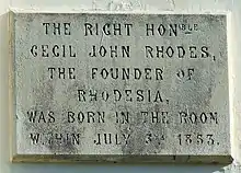 Netteswell House, today Bishop's Stortford Museum, was the birthplace of British imperialist Cecil Rhodes, the financier and founder of diamond company De Beers who gave his name to Rhodesia.[2] It houses the Rhodes Collection, containing interactive displays, archives, artefacts, and photographs, about the life of Rhodes. The Rhodes Birthplace Trust is a registered charity under English law.[3]