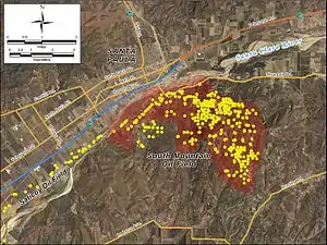 The South Mountain Oil Field is a large and productive oil field in Ventura County, California, in the United States, in and adjacent to the city of Santa Paula. Discovered in 1916, and having a cumulative production of over 158 million barrels (25,100,000 m3) of oil, it is the 37th largest oil field in California and the second largest in Ventura County (after the Ventura field).[1] As of the beginning of 2009, it retains 316 active wells, and has an estimated 1.4 million barrels (220,000 m3) of oil remaining recoverable with current technology. Vintage Production, a subsidiary of Occidental Petroleum, was the largest operator as of 2009.[1]