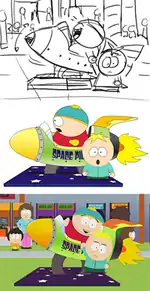 The show's style of animation is inspired by the paper cut-out cartoons made by Terry Gilliam for Monty Python's Flying Circus, of which Parker and Stone have been lifelong fans.[48][11][79] Construction paper and traditional stop motion cutout animation techniques were used in the original animated shorts and in the pilot episode. Subsequent episodes have been produced by computer animation, providing a similar look to the originals while requiring a fraction of the time to produce. Before computer artists begin animating an episode, a series of animatics drawn in Toon Boom are provided by the show's storyboard artists.[50][80]
