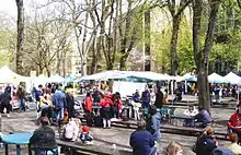 The first Earth Day, on April 22, 1970, was celebrated with a fair on the blocks.[24] In 1975, the Portland city council held Portland's first gay pride fair along the park.[25] It was moved to Tom McCall Waterfront Park the following year.[25] The Seattle to Portland Bicycle Classic, known as STP, concluded in the South Park Blocks from 1979 to 1998, then moved to Cathedral Park.[26] In 1997–1999, Tony n' Tina's Wedding, an interactive theatre, took place using the park as the stage; the wedding was held at the First Unitarian Church and later at the Oregon History Center, and the reception was held at the Portland Art Museum, being a "little street theater" on the park blocks.[27]