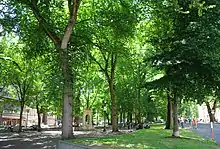 Twelve blocks in length, it is intersected by the Portland Streetcar and forms the Portland Cultural District and the greenspace at the center of Portland State University.[4] The New York Times stated the blocks are "literally at the heart of the city's cultural life."[5] Public artworks in the park include Shemanski Fountain (1926), In the Shadow of the Elm, Peace Chant, (1984), Alexander Phimister Proctor's Theodore Roosevelt, Rough Rider, and a statue of Abraham Lincoln. The park also contains approximately 337 elm, oak, and maple trees valued at $3.4 million, as well as roses.[6][7] A plaque from the Lang Syne Society was placed in the South Park Blocks at Jefferson Street in 1991, commemorating the Great Plank Road.[8]