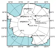 The elevation of the subglacial terrain, based on the seismic soundings, radio sounding (SPQMLT-2 and SPQMLT-3), and gravity measurements, ranged from nearly 1 km below sea level to more than 1 km above sea level. On SPQMLT-1 and SPQMLT-2 the thickness of the ice averaged 2740 m and 2770 m, respectively.[5][6]