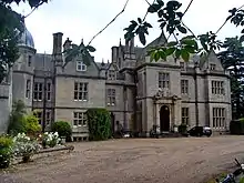 Nicholas Antram, in his 2002 revised volume Lincolnshire, in the Pevsner Buildings of England series, describes the architectural style of South Rauceby as Tudor Gothic, and notes that the hall lacks the Baroque elements of Revesby Abbey and Stoke Rochford Hall.[2] The house is of two main storeys, with basements and attics. The construction material is limestone ashlar. South Rauceby Hall is a Grade II listed building[8] as is the entrance lodge, with its gates and railings.[9] The gardens and park are designated Grade II on the Register of Historic Parks and Gardens of Special Historic Interest in England.[10]