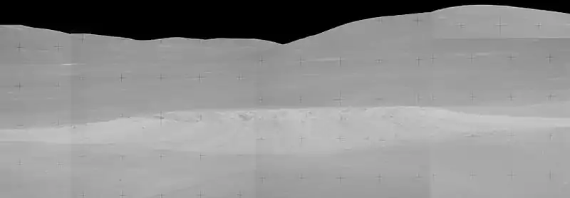 South Ray crater is approximately 700 m in diameter and approximately 120 m deep,[3] with a bright system of rays of ejecta. The astronauts observed that the ejecta of South Ray was very bouldery, and reported that it would have been difficult or impossible to drive there on their rover.[4]
