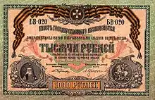 South Russia was established on 8 January 1919 by the White movement after reorganization of their armed forces in the Southern Front, consisting of territory under their control in Ukraine, Crimea, Kuban, the North Caucasus, Black Earth region, Lower Volga, and the Don region. South Russia was an anti-Bolshevik military state under the Armed Forces of South Russia led by General Anton Denikin, and its borders were undefined, changing based on victories or defeats against the Red Army.[1] In March 1920, Denikin established the South Russian Government in Novorossiysk, an attempt at a civil government with the General Command of the Armed Forces of South Russia serving as the legislative body. Less than a month later, the Whites were forced to evacuate from Novorossiysk, the Armed Forces of South Russia and the South Russian Government were dissolved. Denikin resigned and delegated power to General Pyotr Wrangel, who established the new Government of South Russia in Sevastopol and the new Russian Army, commonly known as the Army of Wrangel in April.