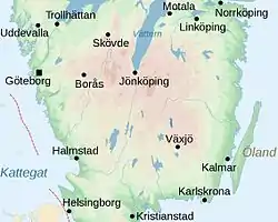 Much of the highlands lies above 200 m.a.s.l. and there are large areas around the highlands that exceed 100 m.a.s.l. The highlands are centered on Småland but cover also large swathes of Scania, Halland, Västergötland, Östergötland and Blekinge.[4] The highest point lies 377 m.a.s.l.[5]