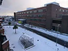 The hospital has its origins in an infirmary which was built for the South Shields Poor Law Union and which opened in 1880.[2] The infirmary became known as the Harton Institution and General Hospital by 1930 and, after joining the National Health Service in 1948, became the South Shields General Hospital.[3] After services were transferred from the Ingham Infirmary at Westoe,[4] the new Ingham Wing was built and the enlarged facilities became known as South Tyneside District Hospital in April 1993.[2]