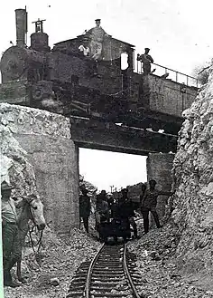 The Otavi Railway, the longest narrow gauge railway in the world, was an industrial enterprise of the Otavi Mining and Railway Company. The railway was constructed by Messrs. Arthur Koppel and Company at a cost of about £2,400 per mile. It was well-built with a ruling gradient of about 1 in 66 (1½%) and minimum curvature of 150 metres (492 feet). The tracks were laid with 30 pounds per yard (15 kilograms per metre) steel rails on 26 pounds (12 kilograms) steel sleepers. From sea level at Swakopmund, the railway rose to an altitude of 3,500 feet (1,067 metres) at Ebony, then dropped to an altitude of 2,640 feet (805 metres) at Usakos and then rose to its highest elevation of 5,200 feet (1,585 metres) at Kalkveld.[4]