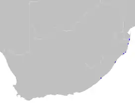 These mangroves grow in the mouths of rivers on the Indian Ocean coast of South Africa, where the sea is warmed by the Agulhas Current, in many cases they are further sheltered from the ocean by sandbanks. The largest areas are in the estuaries of the Mhlathuze River and Lake St. Lucia. Mangroves extend as far south as the Nahoon River at 32°56′S., the most southerly occurrence of mangroves in Africa.[2][3][4]