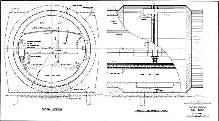 | Design | Low-level trestle, single-tube tunnels, artificial islands, mole fill (1954 alignment) |