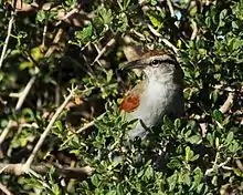 The cup nest is constructed of twigs and stems in a branch fork in a bush or scrub. Two, sometimes three eggs are laid. These are white, marked with grey and reddish-brown, and hatch after about 16 days, with another 14 days to fledging.