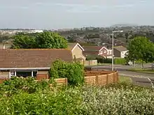 A view over Radipole Lake towards Weymouth town centre (on the left) and Portland (on the right) from Southill. In the foreground is the original caretaker's bungalow of the primary school.