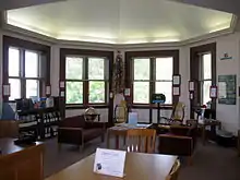 The Southold Lyceum Association (an example of the then-prevalent Lyceum movement in the United States) made a second attempt at creating a library in the town. Organized on October 3, 1871, its purpose was "the improvement and entertainment of its members." It began operations on May 11, 1872 in the home of Jonathan W. Huntting, with H. Howard Huntting as librarian.[3] In addition to lending books, its activities included picnics, lectures, and other fundraising activities, tied in with its purpose of Southold Lyceum Association, of hosting staged plays.[5] An early catalog indicated that annual subscriptions cost $1, and weekly rentals began at 5 cents. The catalog dated June 13, 1884 indicates the library containing 636 books.[6] From 1884-1887 the library was located in a room at the rear of Henry Howell's Drug Store, Henry Howell functioning as librarian.[7] In 1888, the Southold Reading Room Association was formed to house the library. Apparently the maintenance of the library was too burdensome and the Southold Lyceum Association met on May 7, 1896 to dissolve the library.[5] The Association subsequently donated the books to the Southold Union School.[8] A 1947 article noted that, at a time where few schools had their own libraries, "The Lyceum Library enriched the life of this community for more than twenty years and then helped to raise the status of the public school from a district to a union school."[8]