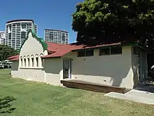 It was as part of the scheme of beautification at Southport that two bathing pavilions were erected, the Main Beach Pavilion and the other smaller building, the Southport Bathing Pavilion on the Esplanade close to the Southport railway station.[3] As the buildings neared completion, the owners of private bathing boxes were given one month's notice to remove the structures.[4][5] The two new buildings were opened on 20 December 1934 by the Minister for Works, Mr Harry Bruce.[6] During a speech at the ceremony, mention was made of Southport being primarily dependent on visitors, and if something was not done for their comfort and convenience (Southport) would lose them. A newspaper report described the design of the buildings as Spanish.[1][7]