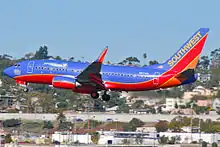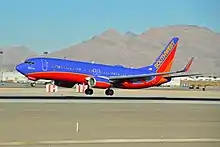 Some Southwest Airlines aircraft feature special liveries or are named with special decals. Southwest gives these aircraft special names, usually ending in "One." All special liveries painted prior to Spirit One originally wore the standard Desert Gold, red and orange colors on the vertical stabilizer and rudder. Subsequent special liveries featured tails painted with the "Canyon Blue" livery, with all earlier specials repainted with the Spirit One livery tail. Any aircraft painted in special liveries will have their winglets painted white. Missouri One was the first special livery to feature a modified version of the "Heart" tail design, with the red and yellow ribbons shrunk in order to fit the Southwest wordmark as it cannot fit on the fuselage like on the other aircraft. Previous special livery aircraft are currently being repainted with the new "Heart" tail design.[41] As of June 18, 2021, all of Southwest's special liveries are on 737-700s, with the only exceptions being Heart One, Heart Two, and Freedom One which are painted on 737-800s.[42]