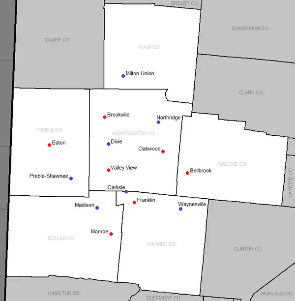 - A huge change came in 1975 when Butler, Northmont, Trotwood-Madison and West Carrollton left and were replaced by Bellbrook, Carlisle, Dixie, and Valley View.
