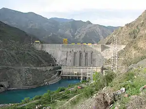 The Toktogul Hydroelectric Power Plant is located on the Naryn River in Osh oblast. The plant began operating in 1975 with 1,200 Megawatts capacity. It has a dam that is 215 meters high. The dam forms the Toktogul Reservoir which began filling in 1974. The reservoir covers 284 square km. The reservoir regulates the flow of the Naryn River, allowing for the irrigation of 0.5 million hectares of land.[29]