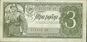 The third Soviet ruble was issued equal to 1,000,000 paper rubles of 1917-1922, simply to handle the unwieldiness over the number of digits in the first currency. Again it continued to depreciate versus the gold ruble until the latter climbed to 50,000 rubles in 1924. Only paper money was issued, in the form of state currency notes in denominations of 50 kopeks, 1 руб, 5 руб, 10 руб, 25 руб, 50 руб, 100 руб, 250 руб, 500 руб, 1,000 руб, 5,000 руб and 10,000 руб.