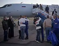 A few minutes after liftoff, which took place at 08:40 UTC, the crew reported feeling weightless, and mission control declared a booster had failed. According to Sergei Krikalyov of Roscosmos, the primary cause of the failure was a collision that occurred during the separation of the carrier rocket's first and second stages. "A deviation from the standard trajectory occurred and apparently the lower part of the second stage disintegrated," he said.[11] Shortly after, a contingency was declared and the spacecraft carrying the crew performed an emergency separation, returning to Earth in a ballistic trajectory, during which the crew experienced "about six to seven times Earth's gravity" followed by a successful landing.[12] The abort occurred at an altitude of approximately 50 kilometres (31 miles);[5] the spacecraft reached an apogee of 93 km (58 mi) then landed 19 minutes and 41 seconds after launch.[13] At 08:55 UTC the search and rescue team was deployed to recover the crew and the spacecraft, which had landed 402 kilometres (250 mi) from the launch site and 20 kilometres (12 mi) east of Jezkazgan, Kazakhstan.[14] Approximately 25 minutes after the search and rescue team took off, NASA announced they were in contact with Ovchinin and Hague. NASA TV broadcast photographs of the crew undergoing medical tests and apparently healthy at Jezkazgan Airport at 12:04 UTC.[15] The crew flew to the Baikonur Cosmodrome to meet their families[16] before leaving for Moscow.[17]